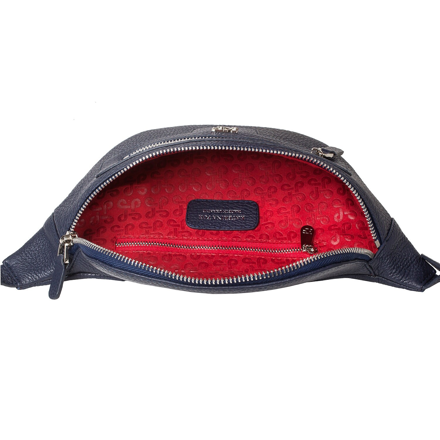 Dark blue genuine leather woman bananka bag from ukrainian designer Katerina Fox. Fashionable and elegant modern bag KF for bright girls and women. This bag is able to attract attention and highlight your exquisite taste. Inside the bag is one large compartment and a convenient zippered pocket for small items, closes the bag on the zipper.